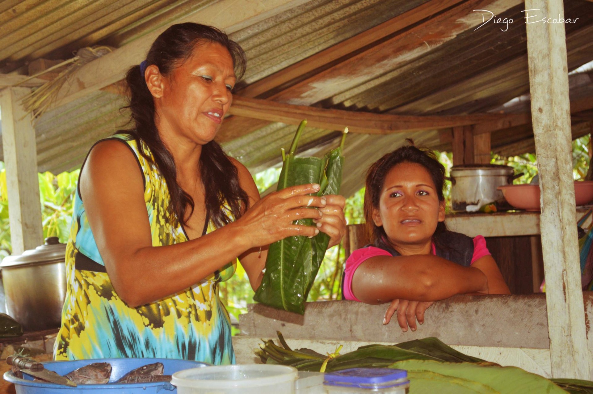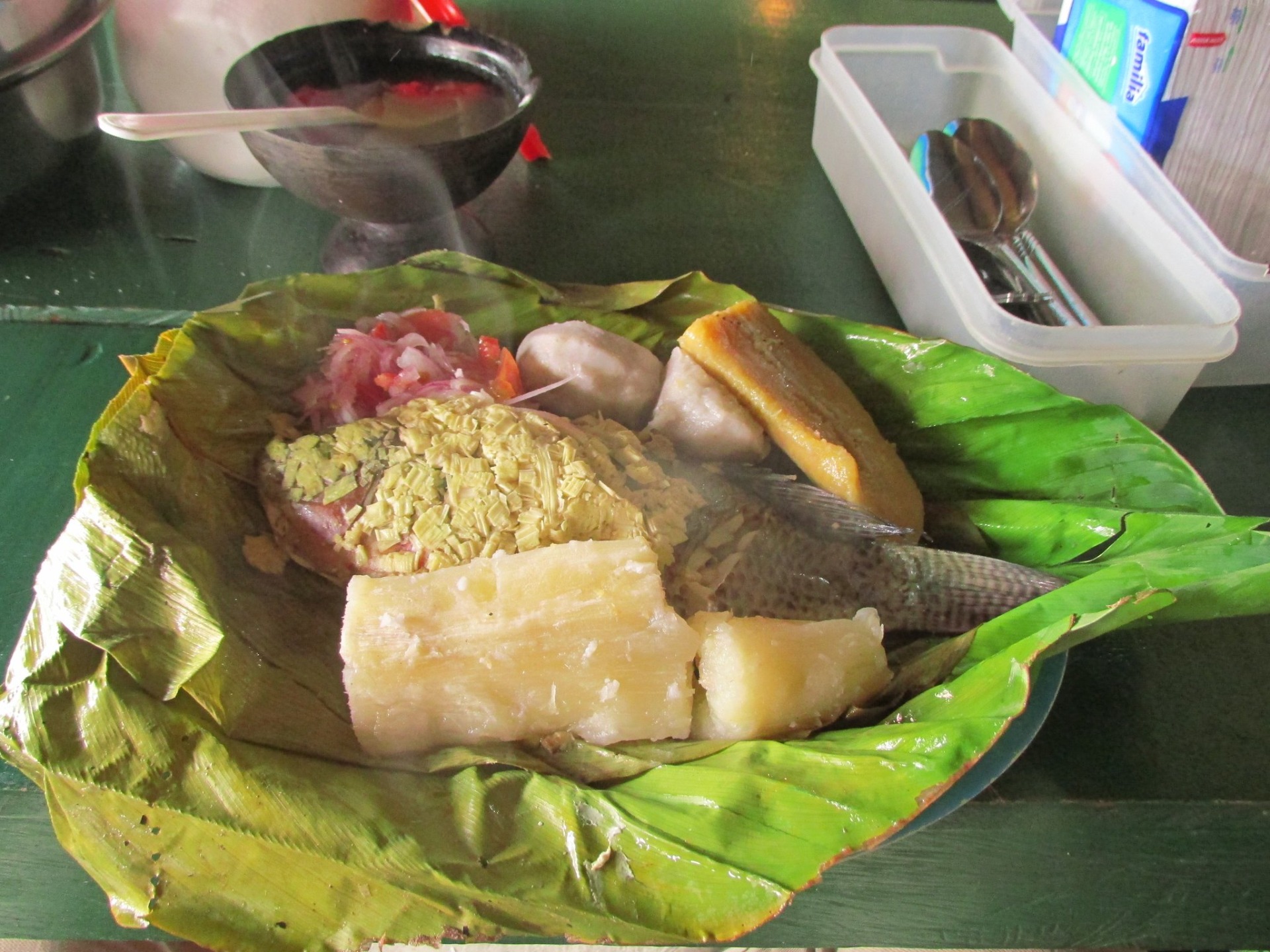 Hojas de bijao, yuca, papa china, carachamas, pilches y mukawas llenas de asua de yuca, así como deliciosos maitos de tilapia y pollo, chontacuros asados se sirven en las mesitas de madera estrechas a los comensales.